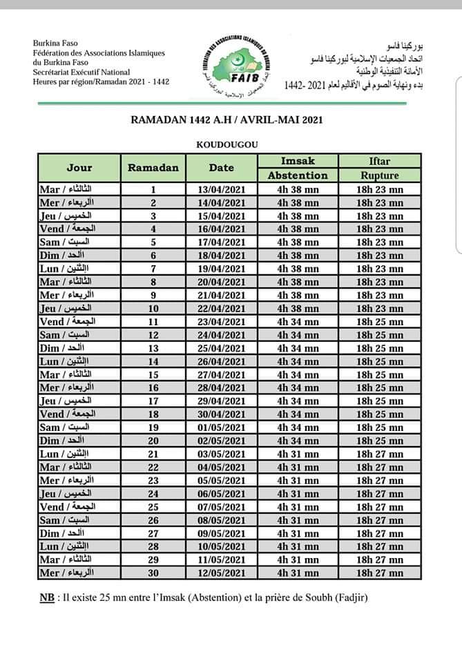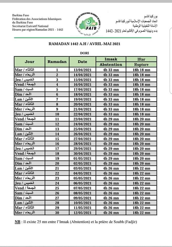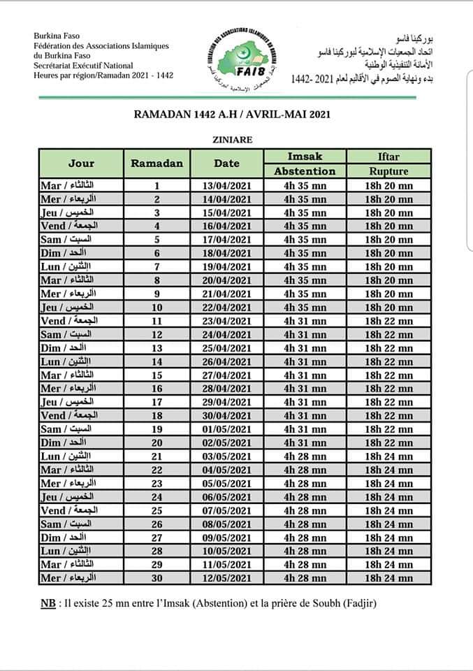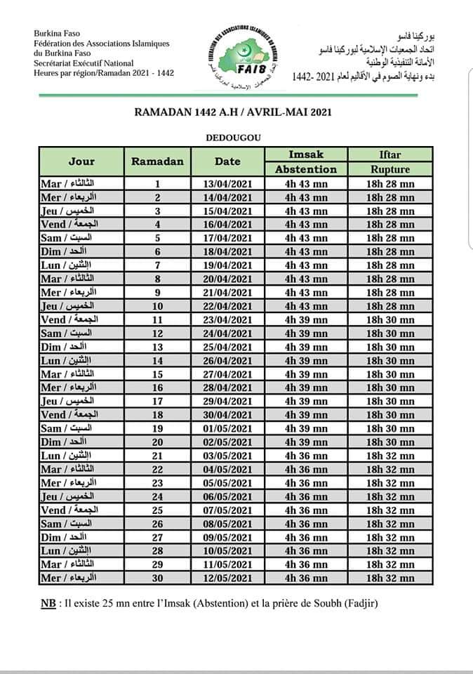 Exceptionnellement, la Fédération des associations islamiques du Burkina (FAIB) met à la disposition des fidèles musulmans des calendriers de 5 villes en tenant compte du décalage horaire. Minute.bf vous propose ces calendriers