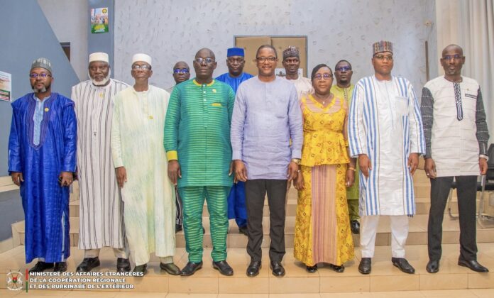 Ouagadougou, le 12 septembre 2025. Le ministre des Affaires étrangères, de la Coopération régionale et des Burkinabè de l’Extérieur, avec à ses côtés Madame le ministre délégué chargé de la Coopération régionale et d’autres collaborateurs, a reçu, ce vendredi 12 septembre 2025, une délégation de la future Union des Collectivités territoriales de la Confédération des Etats du Sahel (AES).