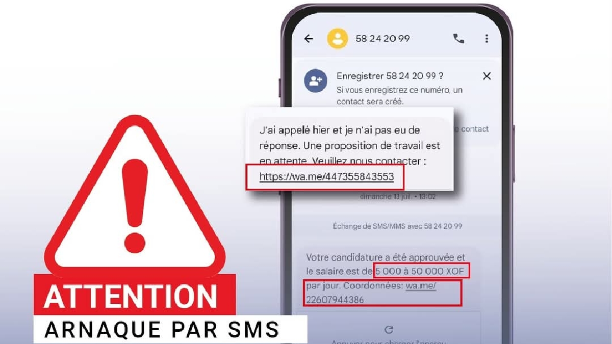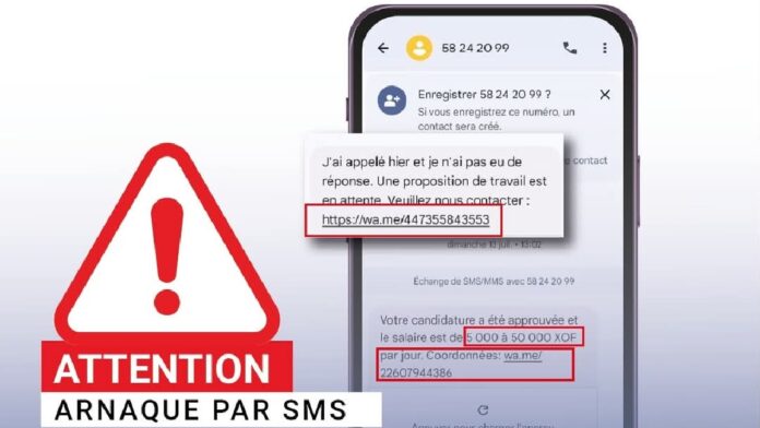 Des individus malintentionnés envoient aléatoirement des messages frauduleux prétendant que la candidature du destinataire a été retenue pour un emploi rémunéré entre 5 000 et 50 000 FCFA par jour. D’autres messages indiquent plusieurs tentatives infructueuses de joindre la victime concernant une offre d’emploi soi-disant en attente. Ces messages contiennent un lien renvoyant vers un numéro WhatsApp.