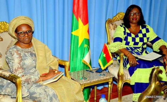Olivia ROUAMBA avec à ses côtés, le ministre délégué en charge de la sécurité s’est entretenue avec Misitura ABDULRAHEEM. L’ambassadeur du Nigéria est venue prendre langue avec le Gouvernement burkinabè aux fins d’avoir la réalité des faits sur les allégations de tueries de pèlerins par des unités militaires.