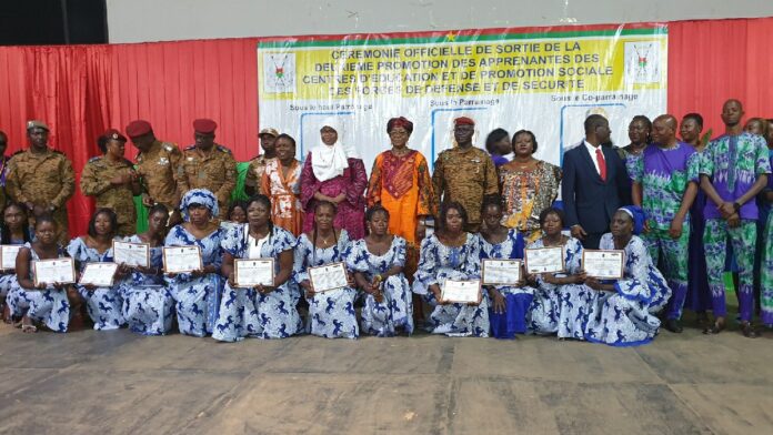 Elles sont au total 167 femmes à avoir effectué leur sortie ce samedi. Après 06 mois de formation dans les domaines de la saponification, coupe-couture, cuisine pâtisserie et coiffure-esthétique, ces veuves des forces de défense et de sécurité tombées ou blessées sur le champ de la lutte contre le terrorisme, ont reçu leur parchemin de fin de formation des mains des premières autorités du pays.
