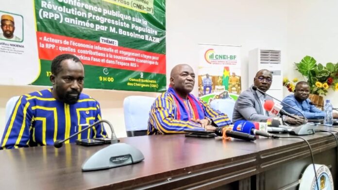 L’objectif de cette conférence publique était d’outiller les acteurs du secteur informel sur les idéaux de la Révolution progressiste populaire (RPP), tout en les sensibilisant à leur rôle dans la construction d’une souveraineté économique nationale et sous-régionale. Selon le Président du CNEI-BF, Salifou Nikiema l’économie informelle constitue une opportunité pour occuper sainement la jeunesse. « Elle est source de création d’emplois et de richesses dans la plupart des pays en développement, comme c’est le cas au Burkina Faso, où elle occupe 93,9 % de la population active du pays, selon l’Institut national de la statistique et de la démographie (INSD) », a-t-il expliqué.