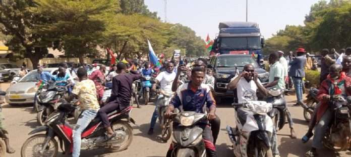 Munis de sifflets et de drapeaux burkinabè et russes, des centaines de manifestants demandent le départ de l’ambassadeur de France et la collaboration avec la Russie.
