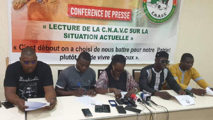Les membres de la Coordination nationale des associations de la veille citoyenne du centre (CNAVC) ont réaffirmé en conférence de presse ce lundi 08 avril 2024, leur soutien « indéfectible » au Capitaine Ibrahim Traoré et son équipe gouvernementale. Ils ont mis en garde « les organisations politiques qui rament à contre-courant de la marche actuelle » du peuple burkinabè.