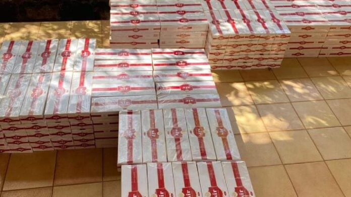 1 050 cartouches, c’est l’équivalent de 10 500 paquets, soit 210 000 bâtons de cigarettes de marque « SIR » saisis dans la nuit du 5 au 6 novembre 2024 dans les encablures de Pâ, sur l’axe Ouagadougou-Bobo-Dioulass; valeur de la saisie, 10 500 000 FCFA.