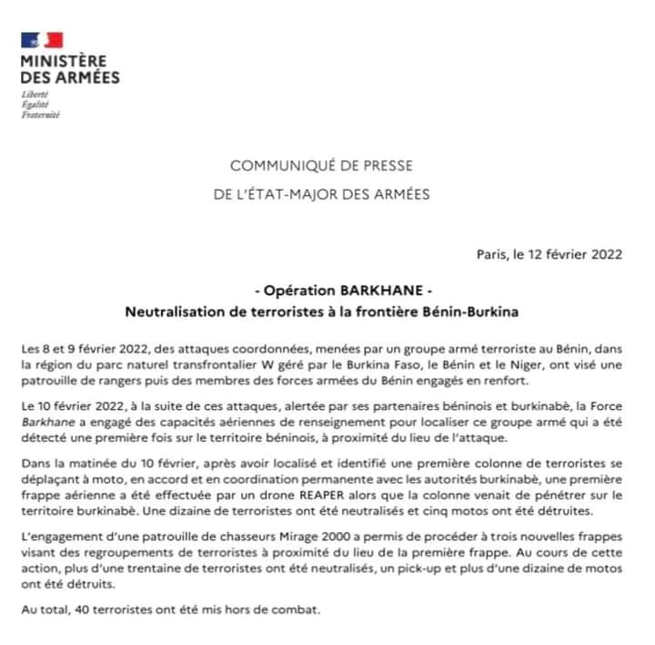 La force antiterroriste française Barkhane a annoncé ce 12 février 2022, avoir neutralisé jeudi, 40 terroristes près de la frontière Burkina-Bénin.