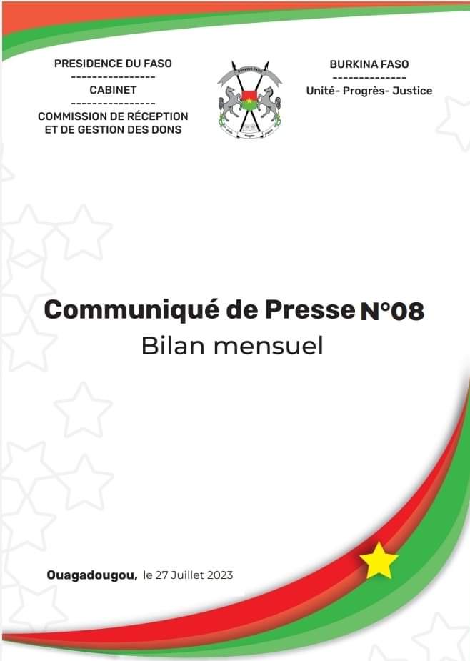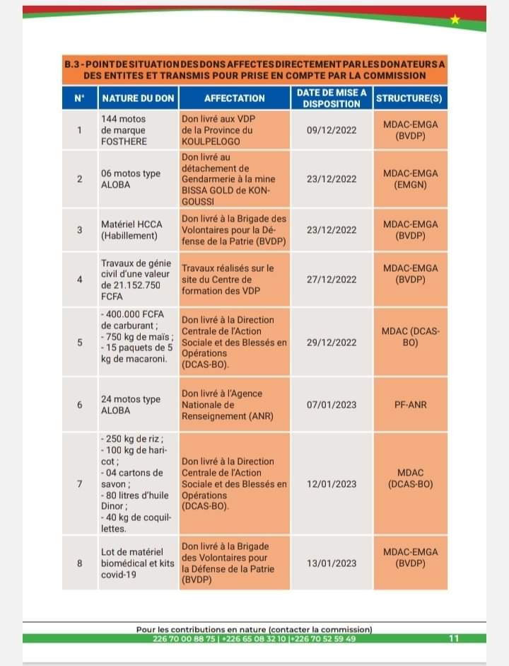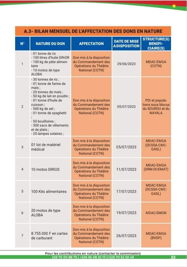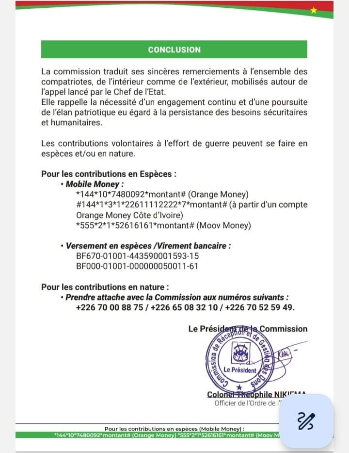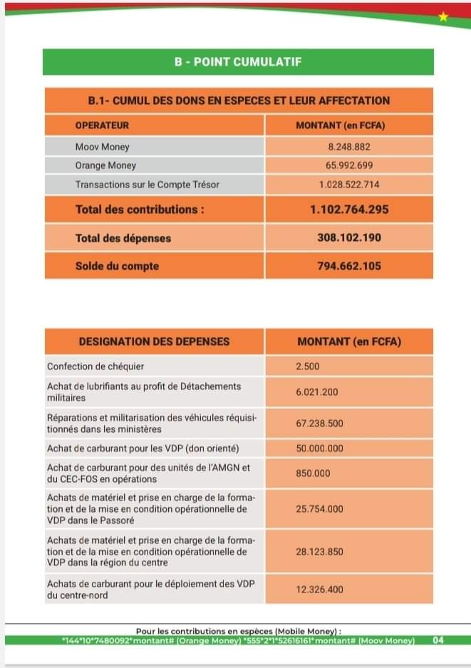 La mobilisation pour les contribution Volontaires à l’effort de guerre continue. Dans le dernier bilan mensuel publié par la Présidence du Faso, ce mardi 22 août 2023, les dons en espèces s’élèvent à 48 942 268 F CFA.