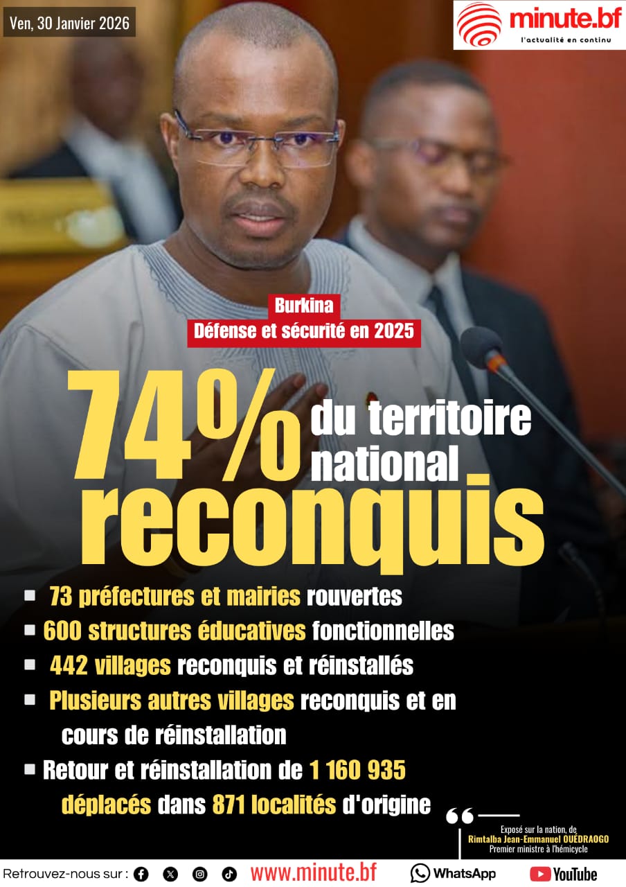 Sur le volet de la reconquête du territoire national, Rimtalba Jean Emmanuel Ouédraogo a assuré que les Forces de défense et de sécurité et les VDP ont totalement le contrôle de près de 74 % du territoire national.