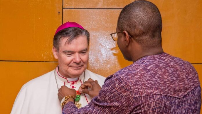 (Ouagadougou, le 23 octobre 2024). Le Nonce Apostolique Burkina Niger, Mgr Michael Crotty a été élevé au rang d’Officier de l’ordre de l’Etalon à titre exceptionnel par les autorités burkinabè.