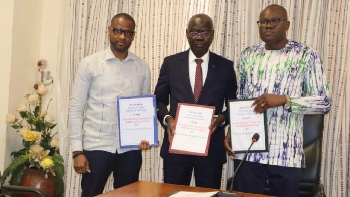 (Ouagadougou, le 26 août 2024). Le ministre de l’Economie et des Finances, Dr Aboubakar Nacanabo, et les représentants des sociétés minières, Lilium mining et Endeavour mining, ont procédé ce lundi 26 août 2024, à une signature de conventions. Ces conventions permettent de mettre fin au différend qui opposait les deux sociétés minières, concernant la transaction sur les mines de Boungou et de Wahgnion, et à l’Etat burkinabè, d’acquérir lesdites mines.