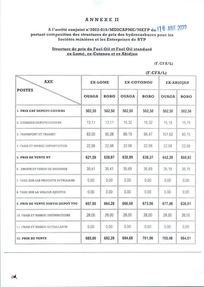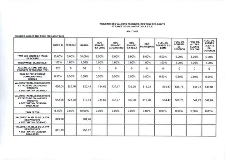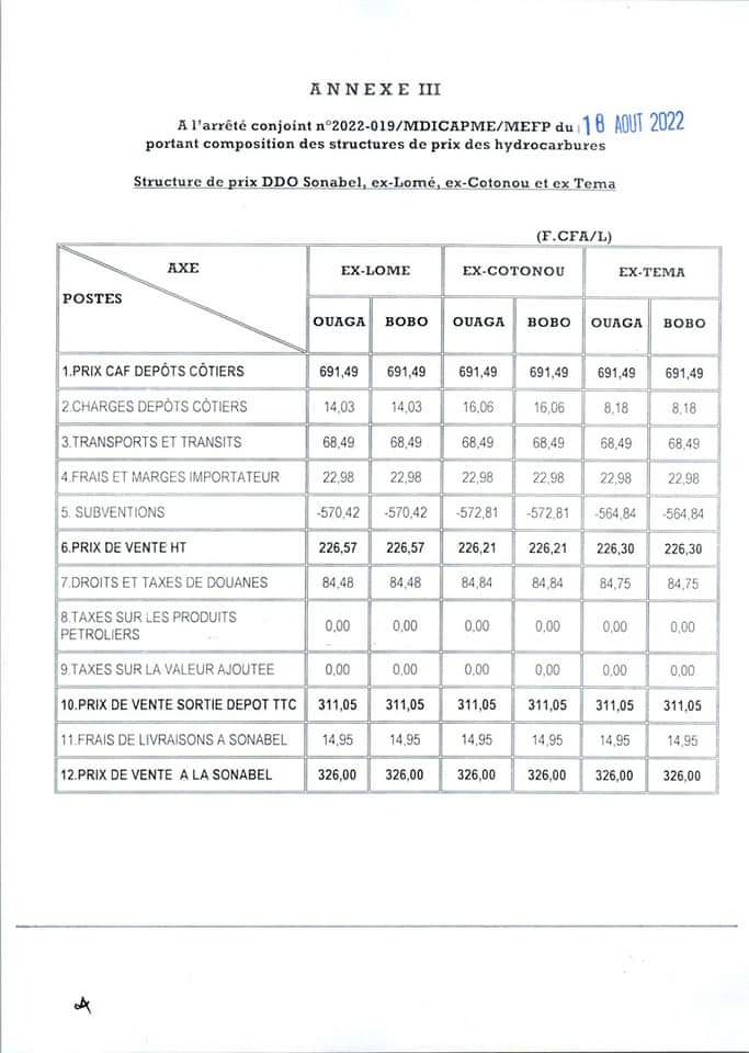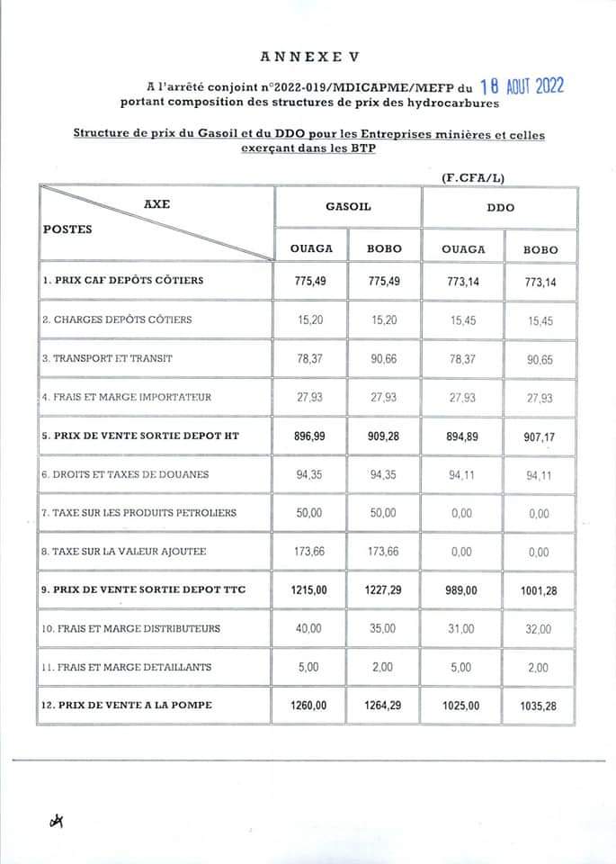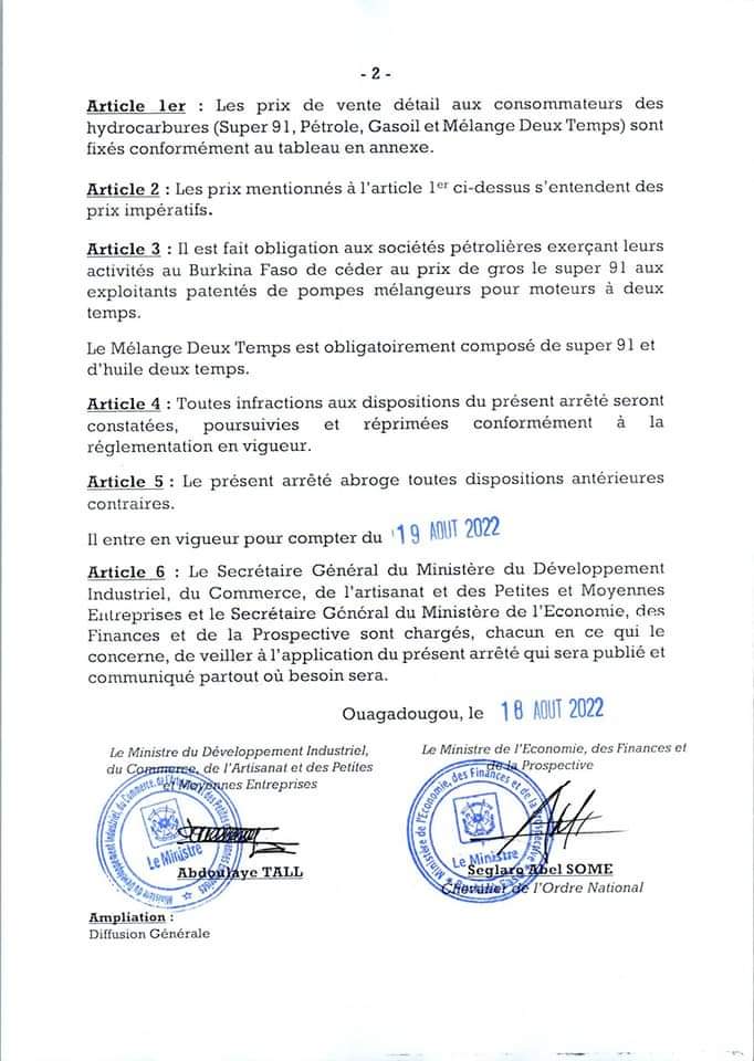 Le ministre en charge du commerce et celui des finances dans un décret conjointement signé ce 18 Août 2022 arrêtent un nouveau prix des hydrocarbures au Burkina Faso.