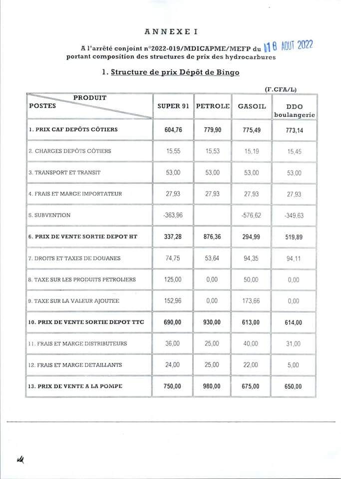 Le prix de vente à la pompe des produits en provenance du dépôt de Bingo est fixé à 750 F/l pour le super 91, 980 F/l pour le pétrole, 675 F/l pour le gasoil et 650 F/l pour le DDO boulangerie.