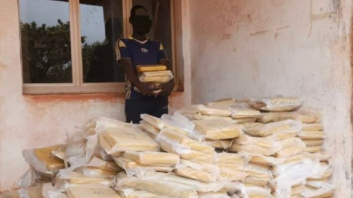 Grâce à la collaboration des populations, avec le concours du Commissariat de Police de District (CPD) de Kourouma et des Volontaires pour la Défense de la Patrie (VPD) de ladite zone, le Service Régional de la Police Judiciaire (SRPJ) des Hauts-Bassins a pu appréhender le présumé malfrat et saisir plusieurs objets dont une importante quantité de chanvre indien composée de six cent quatre-vingt-dix-huit (698) plaquettes, soit environ sept cent soixante (760) kg.