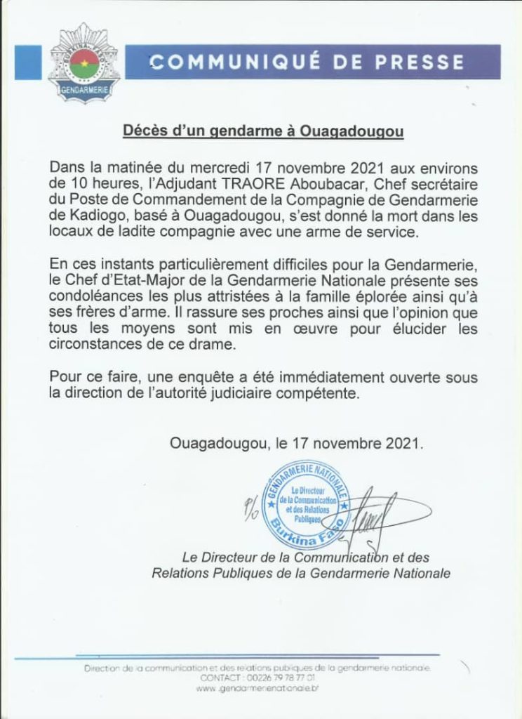 Une triste nouvelle pour la Gendarmerie nationale du Burkina, qui après avoir perdu 28 éléments dans l’attaque du détachement d’Inata, vient de perdre un des leurs. Cette fois, il s’agit d’un suicide.