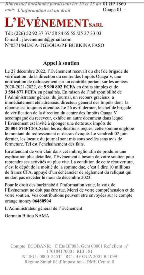 Suite à sa mise sous scellé, le journal d’investigation par la voie de son Administrateur général, Germain Bitiou Nama, a lancé un appel à soutien, ce mardi 06 juin 2023, pour éponger sa dette aux impôts afin de permettre aux lecteurs de retrouver leur Journal… Lisez plutôt !