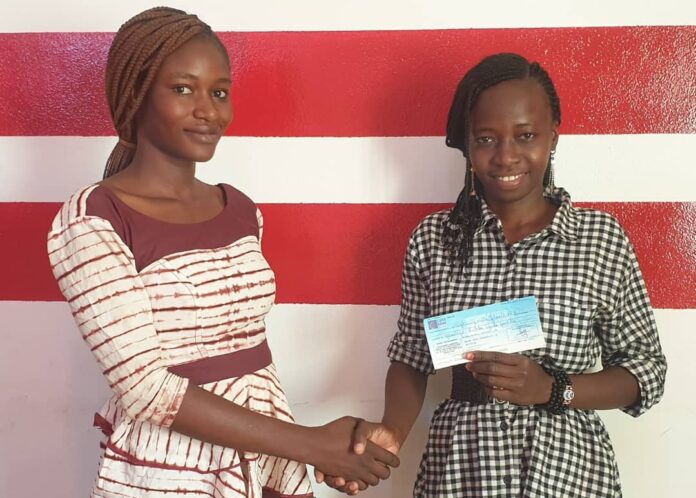 Elle a reçu le chèque des mains de la Secrétaire de Minute.bf, Guéswendé Paré/Bonkoungou, représentant le Directeur de publication.