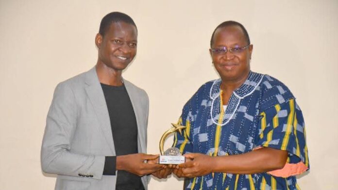 Au cours de cette audience, les responsables de l’Association OMELA ont remis un trophée de reconnaissance au Pr Adjima Thiombiano pour l’accompagnement dont ils ont bénéficié lors de cette foire.