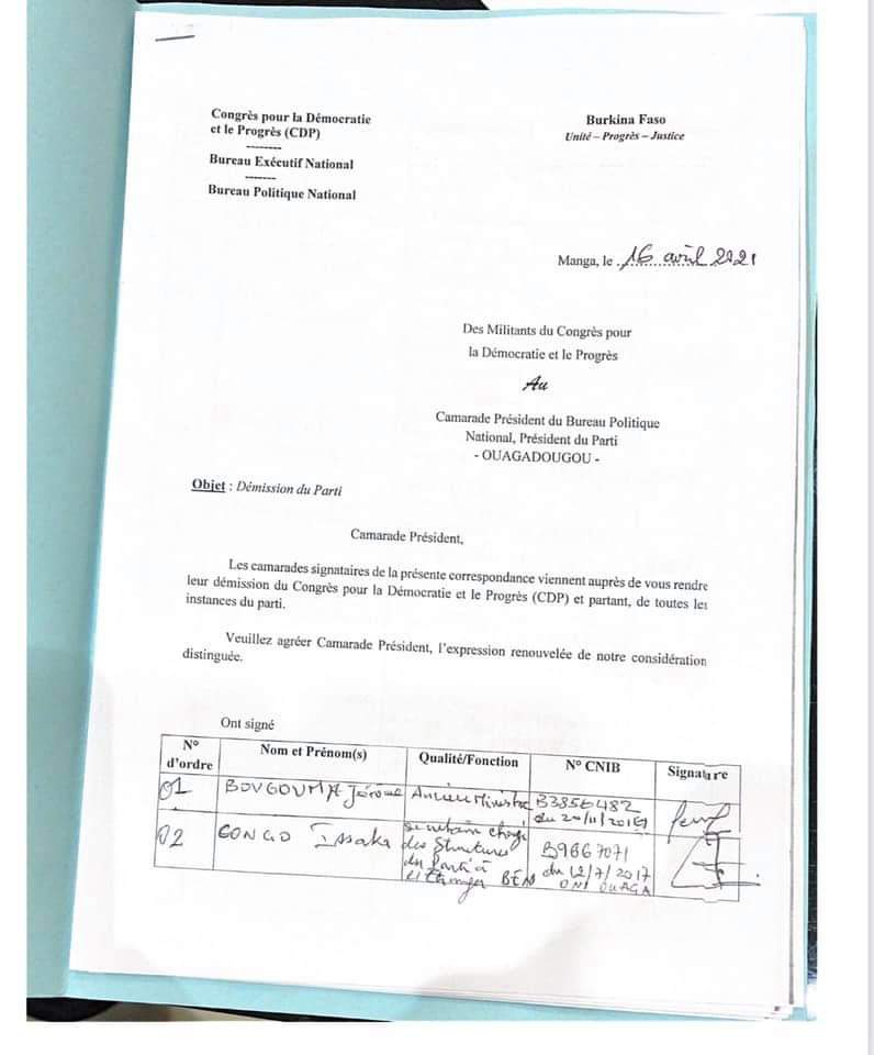 Dans une correspondance en date du vendredi 16 avril 2021 dont www.minute.bf a eu copie, près d’une centaine de militants du Congrès pour la Démocratie et le Progrès de Manga ont signifié leur démission au président du parti, Eddy Komboïgo.