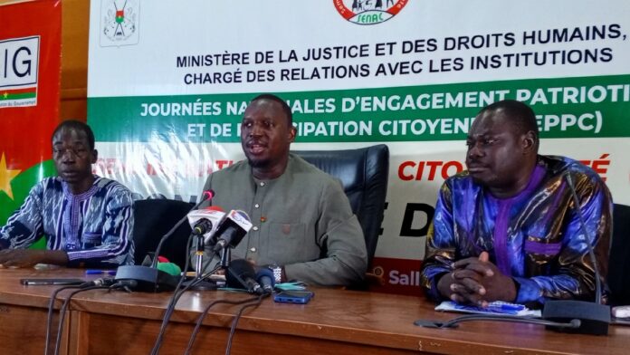 Le Secrétaire général (SG) du ministère de la Justice, des droits humains, chargé des relations avec les institutions, Harouna Kadio, au cours d’une conférence de presse, ce mardi 24 septembre 2024, à Ouagadougou a donné les grandes articulations de la 2e phase des Journées nationales d’engagement patriotique et de participation citoyenne (JEPPC).