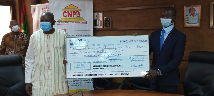 C’est un don d’une valeur de 139 350 000 FCFA composé d’un chèque de 129 350 000 FCFA et d’un don en nature composé de 80 dispositifs de lave-mains, 80 cartons de gel hydroalcooliques, 80 cartons de bavettes chirurgicales, d’une valeur de 10 millions, a détaillé Hubert Millogo, président du comité statutaire du CNPB, qui a encouragé le ministère de la santé à en faire un bon usage afin de limiter la propagation du virus.