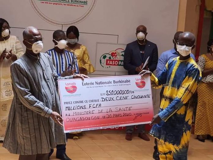 Ce lundi 30 mars 2020, la Loterie nationale du Burkina (LONAB) a volé au secours du ministère de la santé engagé dans cette lutte contre le Covid-19 depuis plusieurs semaines. « Entreprise citoyenne la Lonab offre un chèque de 250.000.000 au ministère de la santé dans le cadre de la lutte contre la pandémie du corona virus dans notre pays », souligne l’entreprise.