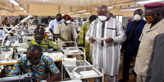 Le premier ministre Christophe Marie Joseph Dabiré et le ministre de l’Education nationale, de l’Alphabétisation et de la promotion des langues nationales, Pr Stanislas Ouaro, ont visité l’atelier de production des moyens de protection des forces armées nationales ce mardi 21 avril 2020. L’objectif est d’encourager et féliciter les militaires pour leur contribution à la lutte contre le Covid-19.