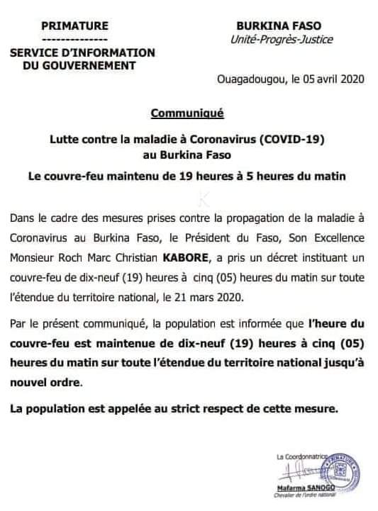 Certaines rumeurs faisaient état de la levée du couvre-feu institué par le président du Faso depuis le 21 mars dernier.