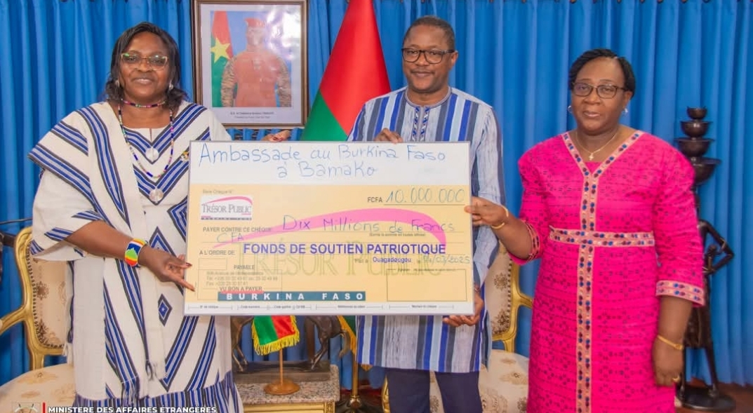 La première responsable de la Mission diplomatique du Burkina Faso à Bamako, est venue présenter au ministre, la quittance d’un don d’une valeur de dix millions de francs CFA (10 000 000), effectué par l’ambassade, à titre de contribution à l’effort de paix au profit du Fonds de soutien patriotique.