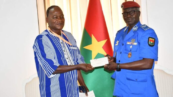 Le 20 février 2024 dans les locaux du Ministère de la Défense et des Anciens Combattants, le Colonel-Major en retraite Adama Ouédraogo a remis au Ministre d’État, Ministre de la Défense et des Anciens Combattants (ME, MDAC) un chèque d’un montant de 500 000 FCFA au profit des FDS.