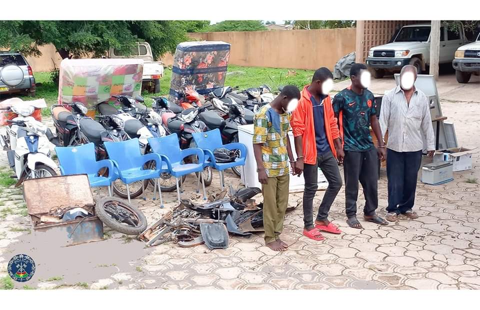 Ainsi, la Police nationale a mis la main sur « quatre (04) individus qui composaient le groupe (…) Parmi eux, un complice qui avait facilité un vol de motos dans une boutique dont il assurait la garde, moyennant une contre-partie de 400.000 FCFA. »