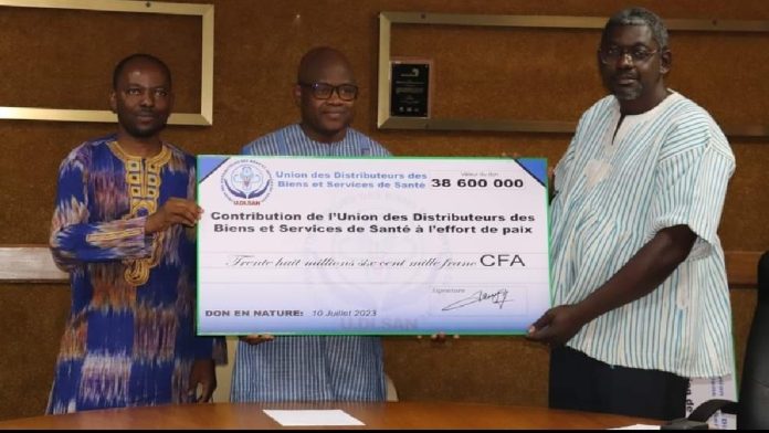 (Ouagadougou, le 10 juillet 2023). Pour soutenir les efforts du gouvernement dans la reconquête du territoire, L’Union des distributeurs des biens et services de santé (UDISAN), a procédé ce lundi 10 juillet 2023, à la remise de leur contribution au Fonds de soutien patriotique.