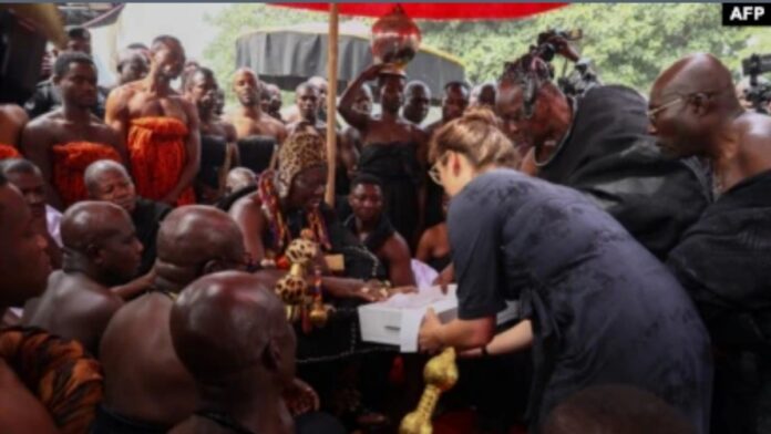 Des bijoux en or, une chaise ornementale et un fouet en queue d’éléphant, constituent entre autres, les objets restitués au roi Asante du Ghana, Otumfuo Osei Tutu II, à l’occasion de son jubilé d’argent. Ces objets pillés pendant la colonisation ont été présentés au cours d’une fastueuse célébration au palais de Manhyia, dans la ville de Kumasi, la région d’Ashanti (sud).