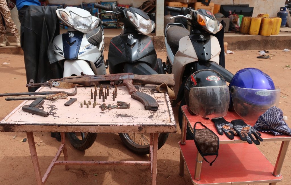 Le butin saisi de leurs mains est composé d’un fusil kalachnikov avec son chargeur garni de vingt-sept munitions, un pistolet automatique de calibre 7,62 mm, plus un chargeur garni de 6 munitions, trois vélomoteurs dont deux de marque Yamaha modèle Sirius et un de marque Yamaha, modèle Force X, des arrache-clous, des casques de moto, des blousons et des caches nez.