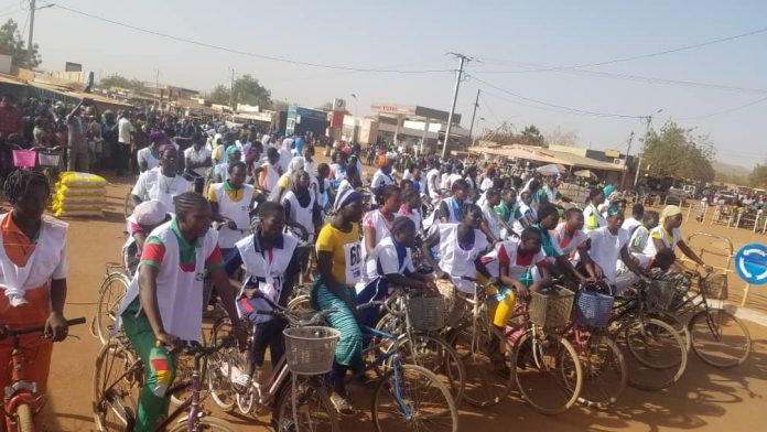 Cette cérémonie ayant débutée par une course cycliste, ce sont 97 filles et dames de tous âges et ethnies qui se sont battues pour arracher la première place. Le périple a consisté à parcourir une distance de trois kilomètres dans quelques artères de la ville. Au terme de cette course, c’est Lydie SAWADOGO, élève du collège privé IQRA qui est arrivé à la tête du peloton. Elle a été suivie par Fati KINDA, élève également au collège de La Salle de Kongoussi. À titre symbolique, les dix premières ont été primées. Un mérite qui a donné droit à deux vélos, des sacs de riz, des gadgets et des enveloppes. Chaque participante a eu droit, quel que soit son rang, à une enveloppe d’encouragement. Une prime spéciale a été décernée a la plus âgée des coureuses Talato OUEDRAOGO qui avait 62 ans révolus. Ce fut une occasion pour les généreux participants de collecter sur place une somme de trente trois milles francs pour magnifier la brave vielle dame.
