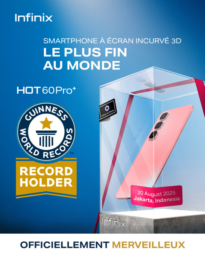 HONG KONG, 26 AOÛT 2025 — Le smartphone HOT 60 Pro+ de Infinix a été officiellement certifié par GUINNESS WORLD RECORDS™ comme étant le smartphone à écran incurvé 3D le plus fin au monde, avec une épaisseur de seulement 5,95 mm à son point le plus fin. La cérémonie de certification, qui s’est déroulée en Indonésie, a marqué une étape historique dans la conception des smartphones et dans le parcours mondial de Infinix.