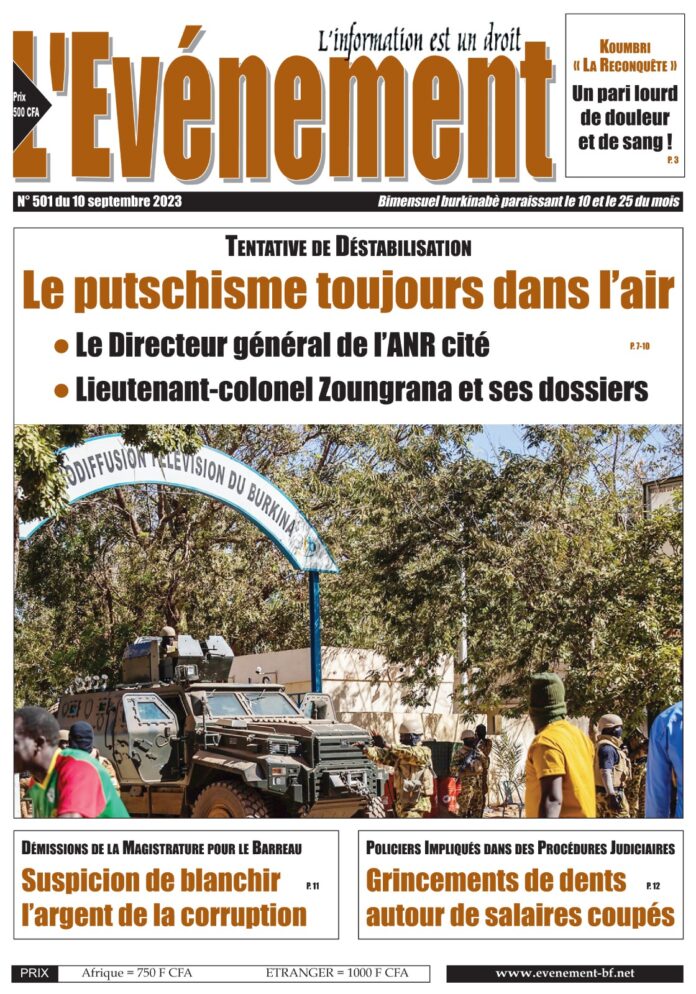PUBLICITE-PARTENAIRE-EVENEMENTLe n⁰501 du journal L’Événement11 septembre 2023PartagerFacebookTwitterWhatsAppTelegramLinkedinImprimer 11 septembre 2023FacebookTwitterWhatsAppTelegramLinkedinImprimer Le n⁰501 du journal L’Événement disponible dans vos différents points de vente habituelsTagsJournal L'ÉvénementPar Armand KINDAArticle précédentGabon : le premier ministre évoque une transition de 24 mois pour des élections libresArticle suivantSéisme au Maroc : Sa Majesté le Roi Mohammed VI préside une séance de travail sur la situation LAISSER UN COMMENTAIRE Annuler la réponseCommenter :S'il vous plaît entrez votre commentaire! Nom :*S'il vous plaît entrez votre nom ici Email :*Vous avez entré une adresse email incorrecte!Veuillez entrer votre adresse email ici Site : Enregistrer mon nom, email et site web dans ce navigateur pour la prochaine fois que je commenterai. Captcha verification failed!Le score de l'utilisateur captcha a échoué. Contactez nous s'il vous plait!ΔArticles connexesLe N⁰518 du 25 mai du journal L’événement disponible 27 mai 2024 Votre journal du 25 Mai 2024 est disponible !A retrouver dans vos kiosques à journaux, vos points de...La Une du N⁰511 du journal L’événement 12 février 2024 Le N⁰511 du journal L'Événement est disponible dans vos différents de points de vente habituels...Le numéro 510 du journal L’Evénement disponible 25 janvier 2024 Vous pouvez également lire le journal dans sa version en ligne, à l'adresse www.evenement-bf.netLe n⁰509 du journal LEvénement 10 janvier 2024 Bonne et heureuse année 2024🎉Votre journal du 10 janvier 2024 est disponible !A retrouver uniquement en ligne sur...