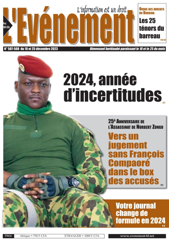 Double parution du journal L’événement. Les n⁰507 et 508 du 10 et 25 décembre 2023 sont disponibles en un, dans la dernière parution du journal. Vous pouvez également le lire en ligne, à l’adresse www.evenement-bf.net