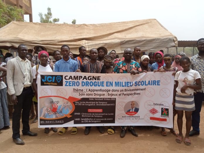La Jeune chambre internationale (JCI) Ouaga Étoile a procédé au lancement de la Campagne « zéro drogue en milieu scolaire ». C’était ce vendredi 18 mars 2022 au lycée municipal de l’arrondissement 03 de Ouagadougou. Cette 4e édition a été placée sous le thème : « Apprentissage dans un environnement sain sans drogue : enjeux et perspectives ». L’objectif est de sensibiliser les jeunes et d’obtenir leur engagement pour une « école sans drogue ».