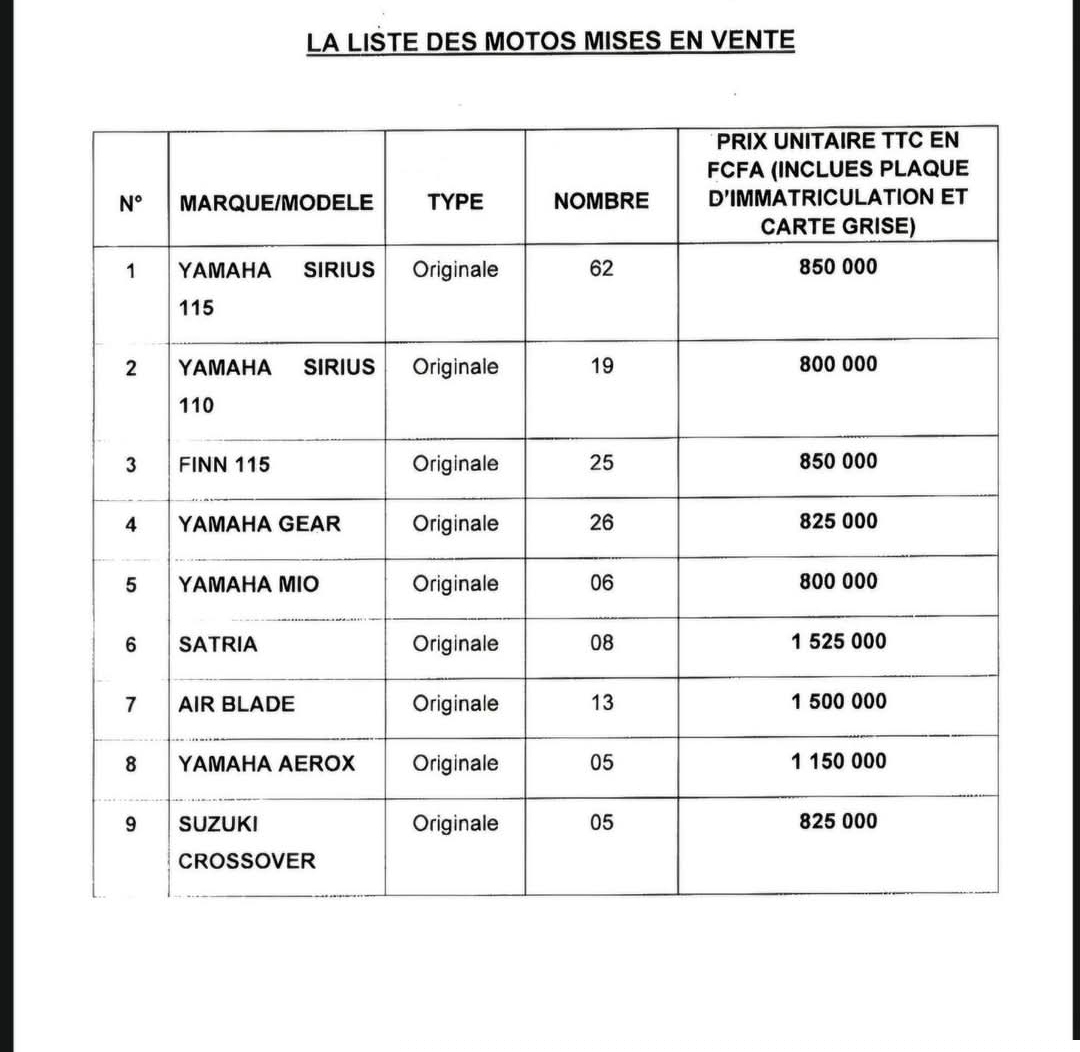 Les prix de vente des motos dans le document ci-après ⤵️