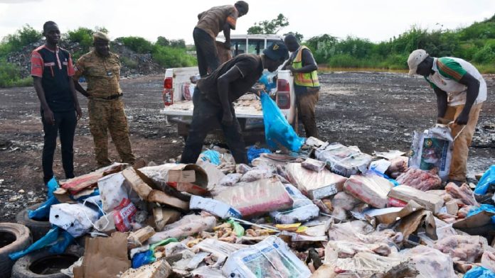 La troisième Légion de la Gendarmerie nationale, à travers sa section de recherche a mis la main sur 1 000 poulets impropres à la consommation, le 16 août 2023, à Toukin, dans l’arrondissement 4 de Ouagadougou.