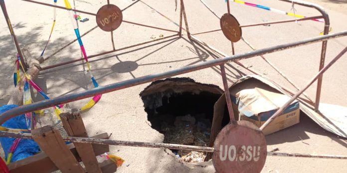 Un trou béant au milieu de la voie qui passe juste devant la porte ouest de l’Université Joseph Ki-Zerbo. C’est le constat que les riverains et usagers de ce tronçon peuvent faire.