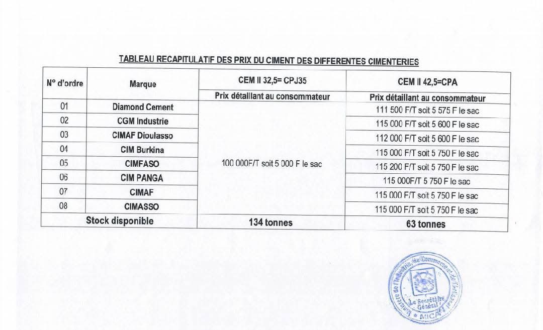 Conformément aux dispositions réglementaires relatives à la fixation des prix du ciment, les tarifs appliqués sont ceux prévus par la réglementation en vigueur, soit 100 000 FCFA/Tonne et 5000 FCFA le sac. Les prix sont détaillés dans le tableau annexé.