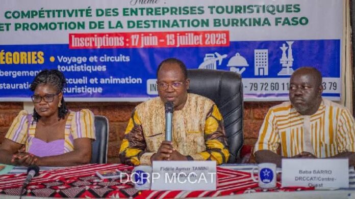 Le Secrétaire général du Ministère de la Communication, de la Culture, des Arts et du Tourisme, Bètamou Fidèle Aymar TAMINI, a présidé la conférence de presse de lancement de la 7e édition du Prix National de l’Entrepreneur Touristique (PNET), en présence de la Directrice générale du Tourisme, Monique OUÉDRAOGO/ILBOUDO et du Directeur régional de la Communication, de la Culture, des Arts et du Tourisme, Baba BARRO, ce mercredi 25 juin 2025 à Koudougou.