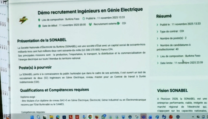 Dans le cadre de sa politique de digitalisation, la Société nationale d’électricité du Burkina (SONABEL) a officiellement lancé, ce mardi 11 novembre 2025, sa plateforme numérique denommée « e-recrutement ». C’est une solution digitale qui vise à moderniser et automatiser l’ensemble des procédures de recrutement au sein de la nationale de l’électricité.
