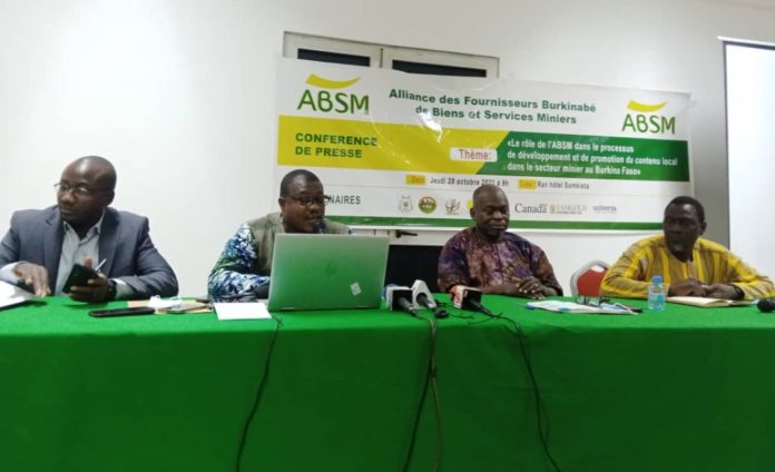 Les membres de l’Alliance des Fournisseurs burkinabè de Biens et Services miniers (ABSM) étaient face à la presse ce jeudi 28 octobre 2021 à Ouagadougou. L’objectif de cette rencontre avec la presse était de faire connaitre à l’opinion nationale et internationale ce que l’ABSM a pu engranger comme acquis, présenter les défis auxquels elle fait face et aussi les perspectives pour les années à venir en matière de contenu local au Burkina Faso.