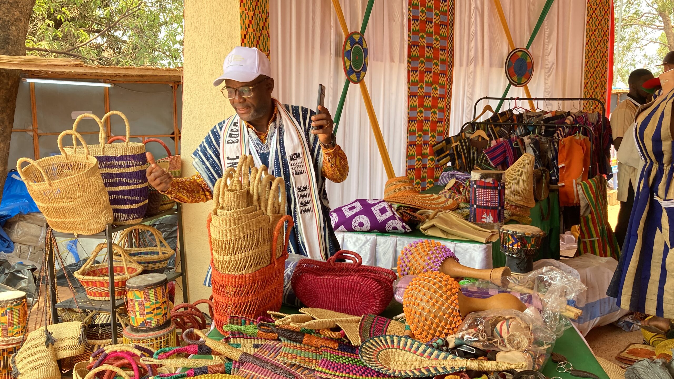 Au stand du pays invité d’honneur, les visiteurs sont immédiatement plongés dans l’univers culturel ghanéen. Tissus kente à divers motifs, pagnes fugu, objets d’art, sacs traditionnels et instruments de musique composent entre autres le décor. Sur place, c’est Joseph Appiaghey, Directeur régional de l’Autorité du tourisme du Ghana pour la région Est, qui accueille les festivaliers. Il a été mandaté par le gouvernement ghanéen depuis Bolgatanga, pour prendre part à cet événement majeur avec une délégation d’artisans et de promoteurs culturels.