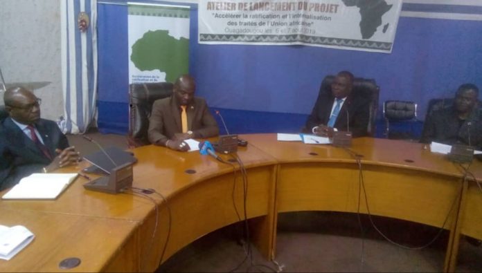 L’atelier de lancement du projet « accélérer la ratification et l’internalisation des traités de l’union africaine » s’est tenu le 7 août 2019 à Ouagadougou, dans la salle de conférence du ministère des Affaires étrangères. Placé sous le patronage des ministres des affaires étrangères du Niger représenté par Abdoul Aziz Daouda Salifou et du Burkina représenté par l’ambassadeur Seydou Sinka SG du ministère des affaires étrangères, ce projet pilote doit favoriser l’internalisation des traités ratifiés dans 6 pays membres de l’Union Africaine.